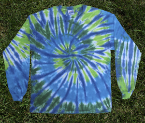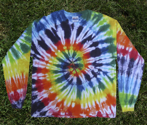 When you love tie-dye but it's too cold for a regular tee, wear a long-sleeved tee! 100% cotton jersey with ribbed cuffs. This one is tie-dyed in a vivid rainbow spiral.