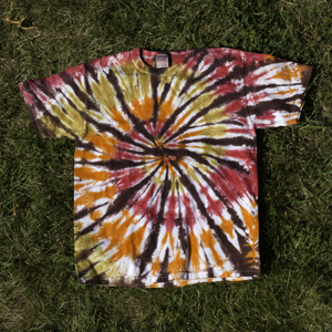 Catch the colors of autumn leaves with this tie-dye tee of red, orange, gold, and brown. 100% cotton jersey.
