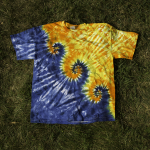 This tie-dye tee has an unusual triple spiral in blues and oranges that looks like ocean waves and tongues of fire. 100% cotton jersey Tee.