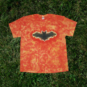 A black bat flies out from this tie-dye tee. Perfect for Halloween or bat fans!