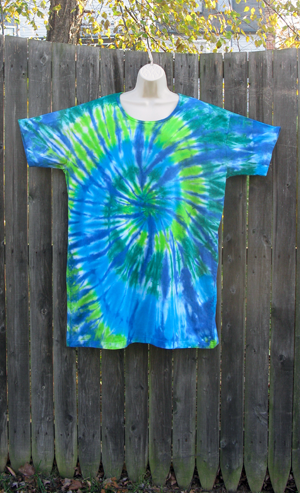 Cool blues and greens spiral out on this roomy Tee-shirt/dress, perfect as a beach cover-up or sleep Tee. One size, 55 inches wide at the chest and 37 inches long.