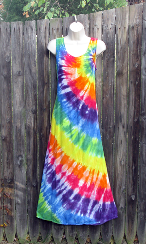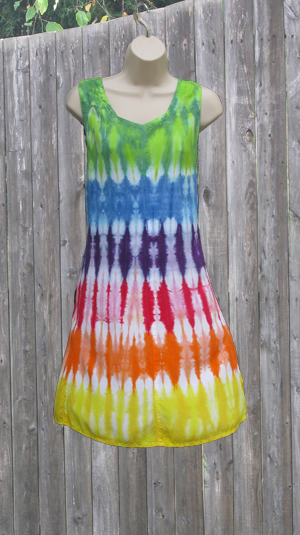 A short (above knee) version of the long rayon tank dress, perfect for showing off tanned legs. Ties in the back to adjust the fit. Tie-dyed in beautiful rainbow stripes.