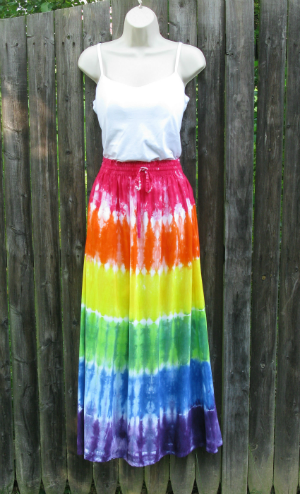 Rayon is soft and flowing, a dream to wear and walk in. This long skirt has side seam pockets and an elastic waistband with a drawstring, tie-dyed in rainbow stripes. Hand made in Bali.