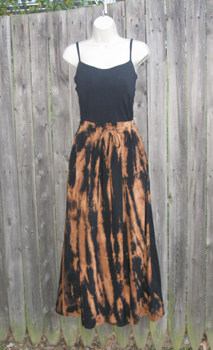 This long black sweeping rayon skirt has burnout streaks of brown. Side seam pockets and an elastic waistband with a drawstring. Hand made in Bali.