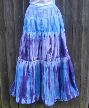Another romantic light cotton skirt with five gathered tiers and a ruffled hem, trimmed with Victorian Lace. Buttons down the front and elastic in the back of the waistband. Tie-dyed in twilight shades of blues and purples.