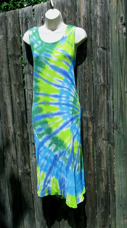 Another short (above knee) version of the long rayon tank dress, perfect for showing off tanned legs. Ties in the back to adjust the fit. Tie-dyed in waves of ocean blues and greens.