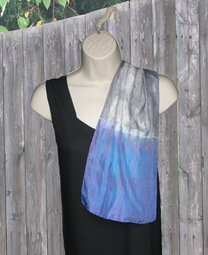 This silk scarf is dyed in a gorgeous combination of cerulean blue and gun metal gray. Hand washable.