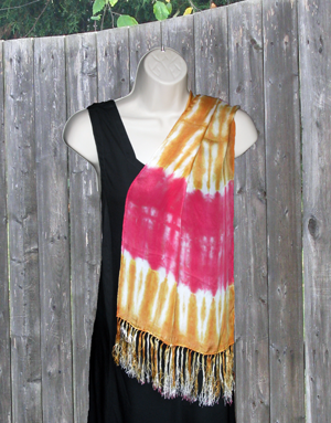 A beautiful silk scarf with fringe, dyed in bands of red and gold. Machine washable (gentle cycle).