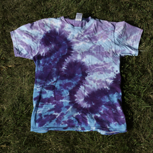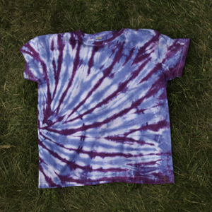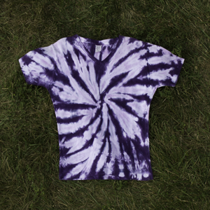 Shades of purple with black streaks sweeping out in a spider pattern. Choose a crew neck (slightly lower than unisex) or a V-neck. 100% cotton jersey.