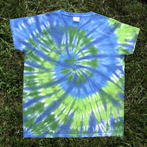 Cool blues and greens spiral around this tee, one of our customer's favorites. Choose a crew neck (slightly lower than a unisex Tee) or a V-neck. 100% cotton jersey.