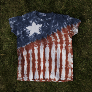 Perfect for Flag Day or any time you're feeling patriotic - a white star tie-dyed on a blue background with flag red stripes. Choose a crew neck (slightly lower than unisex) or a V-neck. 100% cotton jersey.