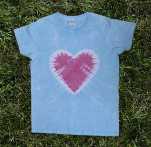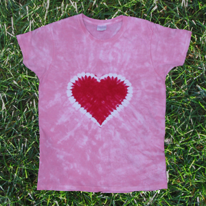 A crisp pink heart is tie-dyed against a pale pink background. Choose a crew neck (slightly lower than unisex) or a V-neck. 100% cotton jersey.