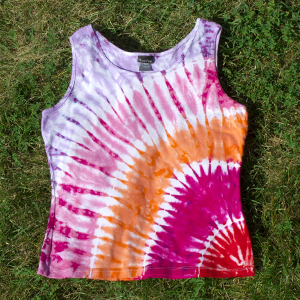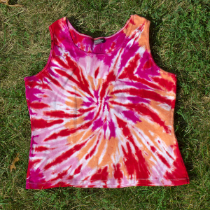 What says summer better than hot pink, peach, and fiery red? 100% cotton tie-dye tank top. Choose either Ribbed for a close fit or Jersey for a looser, longer style.