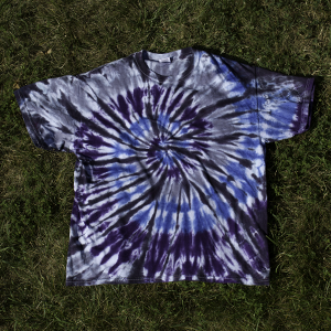 I call this spiral of black, grey, blue, and purple "Cosmos" because it reminds me of outer space. What does this tie-dye tee remind you of? 100% cotton jersey Tee.