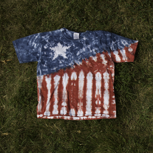 This tie-dye tee is perfect for Memorial Day, 4th of July or any time you're feeling patriotic. White star tie-dyed against a flag blue background, with red and white stripes below. 100% cotton jersey Tee.