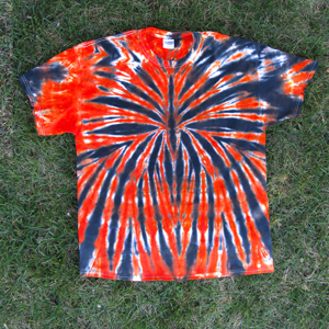 This tie-dye tee has an unusual triple spiral in blues and oranges that looks like ocean waves and tongues of fire. 100% cotton jersey Tee.