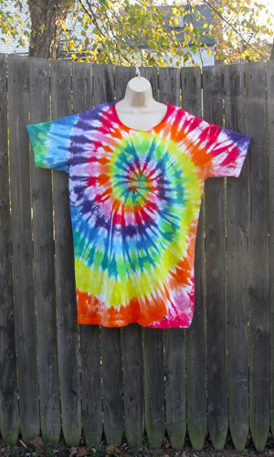 It's a dress, it's a sleep tee, it's a beach cover-up! This roomy shirt/dress is versatile and comfortable in 100% cotton jersey. One size, 55 inches wide at the chest and 37 inches long. Tie-dyed in a beautiful rainbow spiral.