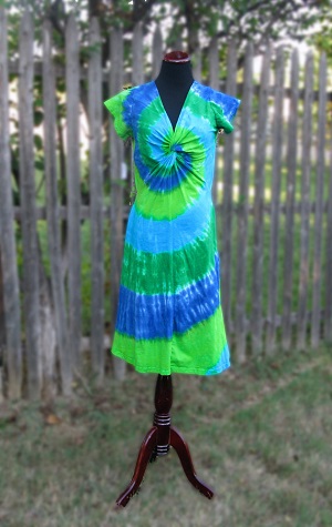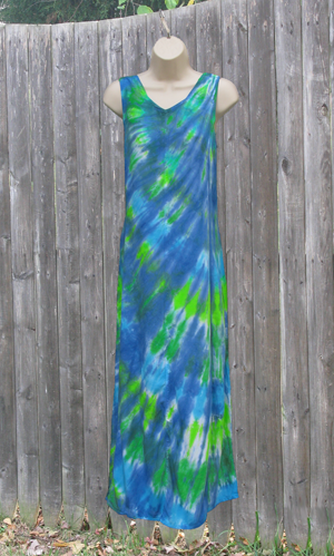 Another short (above knee) version of the long rayon tank dress, perfect for showing off tanned legs. Ties in the back to adjust the fit. Tie-dyed in waves of ocean blues and greens.
