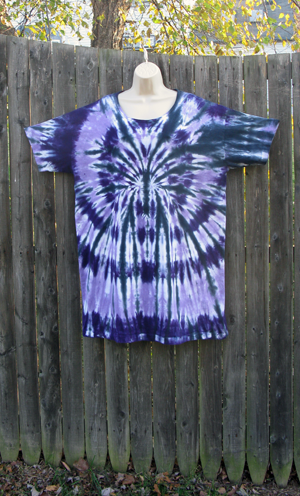 This dress/sleep tee/beach cover-up is tie-dyed in a spider pattern of black on purples. 100% cotton jersey. One size, 55 inches wide at the chest and 37 inches long.
