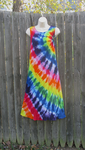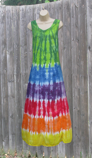 A short (above knee) version of the long rayon tank dress, perfect for showing off tanned legs. Ties in the back to adjust the fit. Tie-dyed in beautiful rainbow stripes.