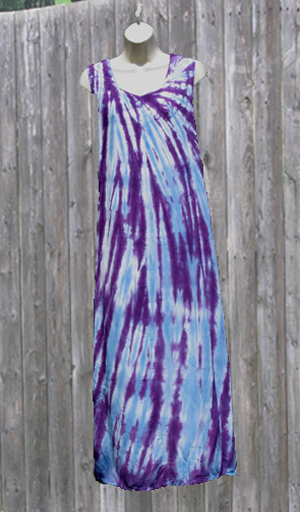 This rayon tank dress is cool and flowing, the perfect way to be comfortable and look great when it\'s hot outside. Ties in the back to adjust the fit. Tie-dyed in swirls of blueberry and raspberry that swoop from shoulder to hem.