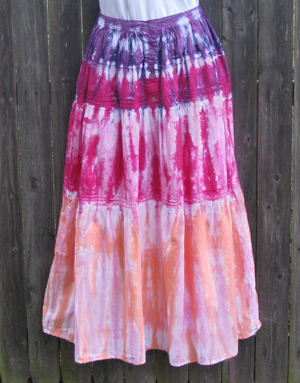 A very romantic light cotton skirt with five gathered tiers and a ruffled hem, trimmed with Victorian Lace. Buttons down the front and elastic in the back of the waistband. Tie-dyed in sunrise colors of peach, pinks, and purple.