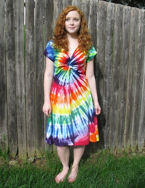 This is a unique and beautiful dress! Twisted front, gently shaped waist, and flared skirt, made from lightweight cotton jersey that won't weigh you down on hot days. Shaded rainbow spiral follows the lines of the bodice and sweeps across the skirt.