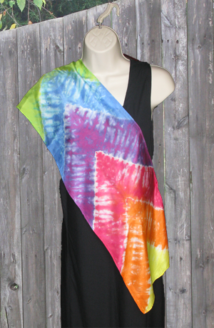 A beautiful silk scarf, dyed in brilliant rainbow colors. Awesome with a black dress!